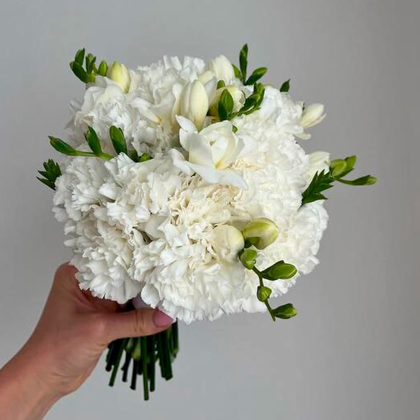 Комбинация белых гвоздик и фрезий — это идеальное сочетание стойкости, нежности и изысканности. Эти цветы прекрасно дополняют друг друга, образуя красивые контрасты в текстуре и форме. Гвоздики добавляют насыщенности и плотности, а фрезии — легкости и воздушности, создавая динамичную композицию.