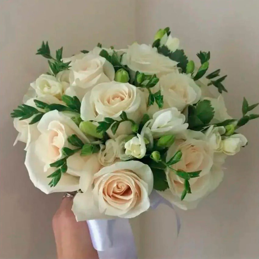Белый символизирует чистоту намерений и прозрачность чувств. Кремовый говорит о зрелой нежности и такте. Чайный добавляет тепло, намек на домашний уют и светлую ностальгию. Розы — о верности и уважении, фрезии — о доверии и искренности, эвкалипт — о защите и спокойствии. Вместе они создают язык, который деликатно поддерживает обещание, данное в день единения.