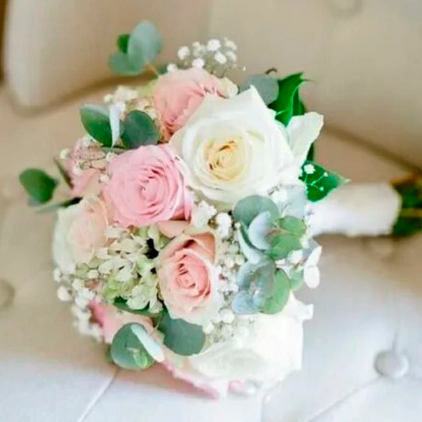 - Баланс текстур гладкие розы, воздушная гипсофила, графичный эвкалипт