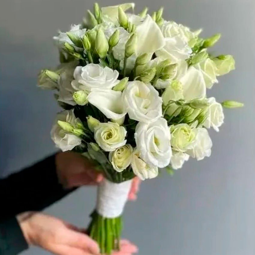 Каллы и эустомы в белом цвете являются олицетворением чистоты, невинности и искренности чувств. Эти цветы идеально подходят для свадебных церемоний, подчеркивая важность и торжественность момента. Каждый человек, встречающий невесту с таким букетом, почувствует ауру любви и счастья, царящую вокруг.