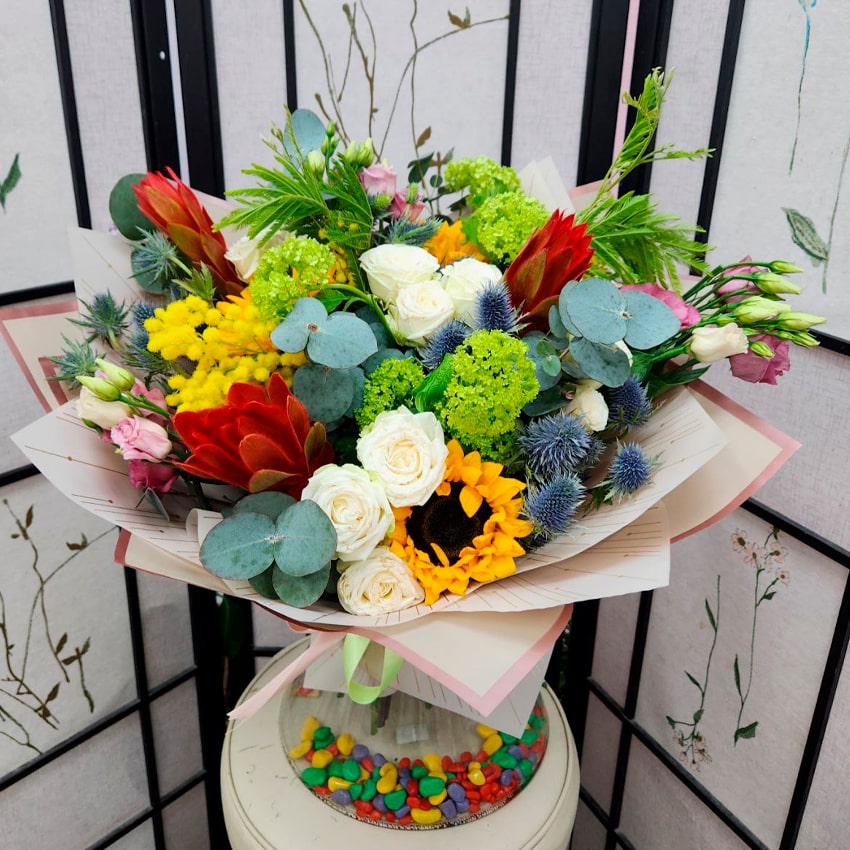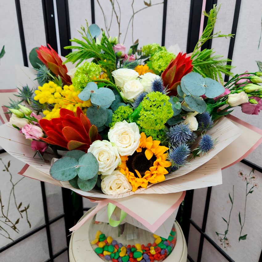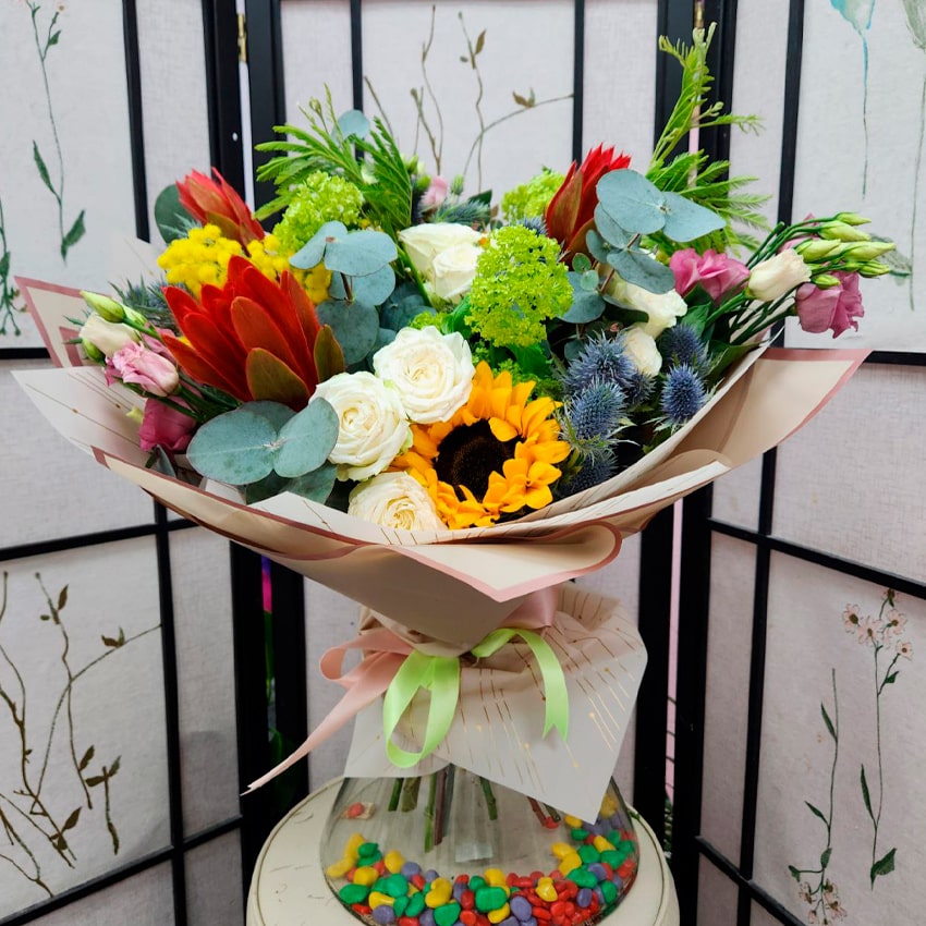 Ключевая черта — абсолютное многообразие текстур, объёмов и запахов. Сочетание изысканной зелени, свежести эвкалипта и базовых акцентов жёлтых подсолнухов превращает букет в многослойное произведение — он не теряет сочности до последнего дня. Необычные сафари придают глубину и загадочность, а эквадорские розы обрамляют и подчеркивают общую роскошь. Даже по отдельности каждый элемент выглядит эффектно, но в ансамбле цветы усиливают достоинства друг друга.