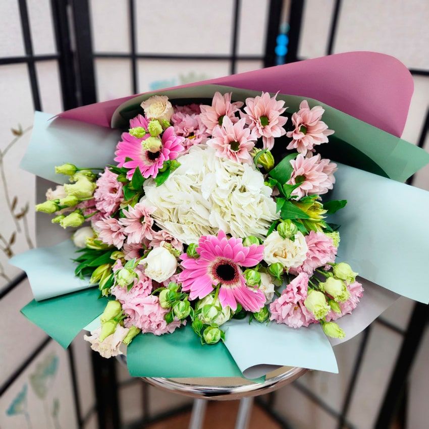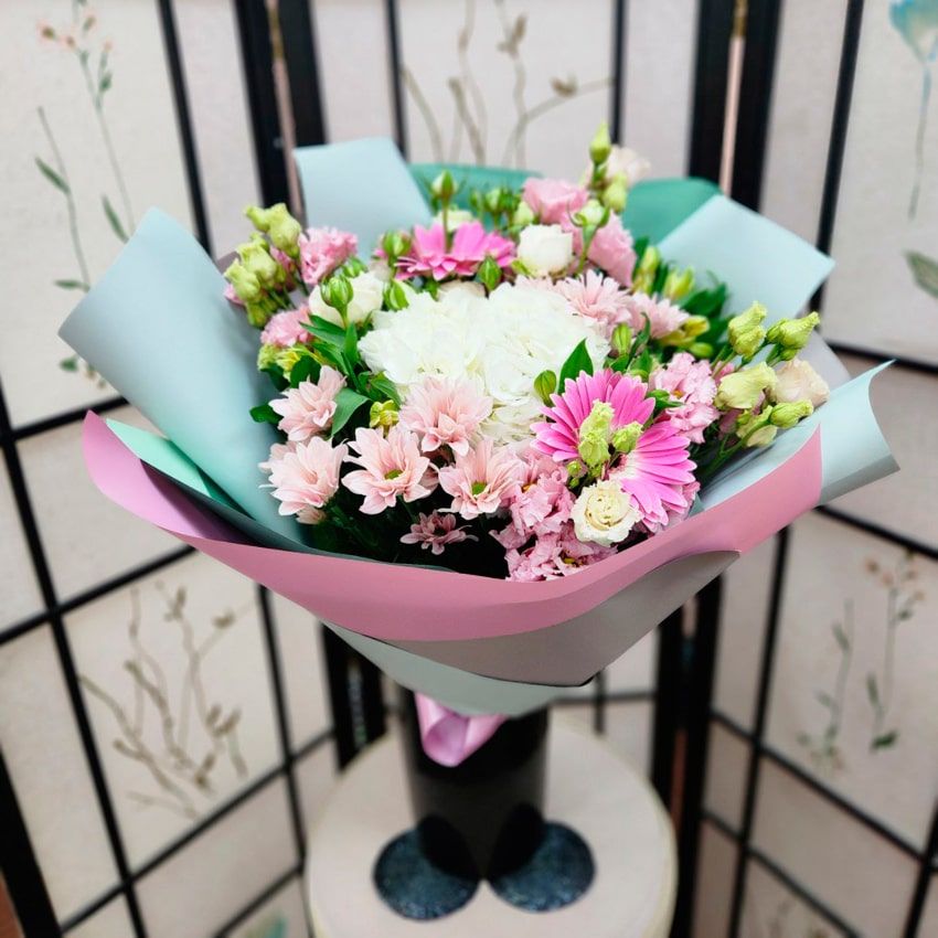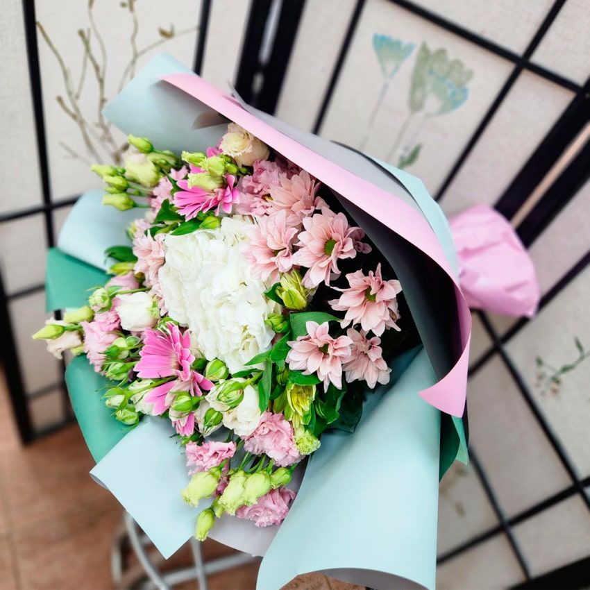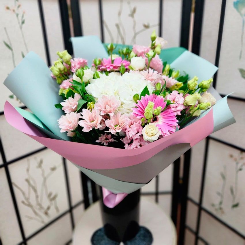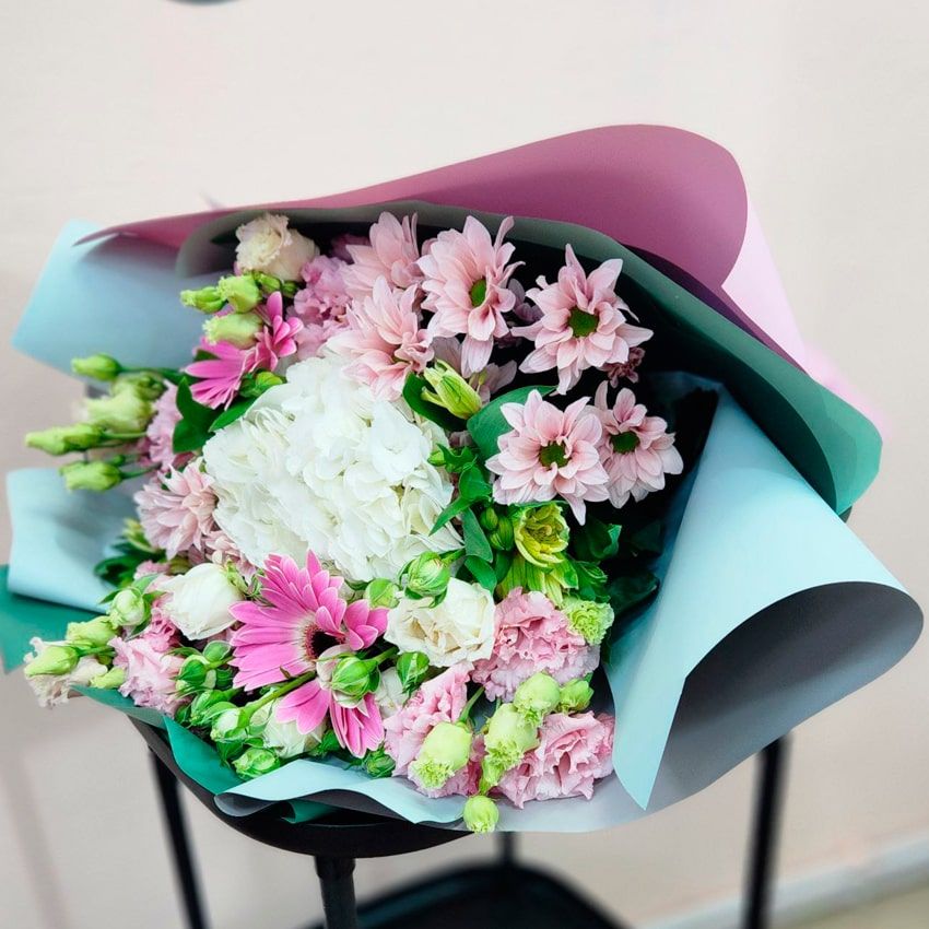 Во-вторых, многообразие текстур и форм даёт необыкновенную глубину: мягкость лепестков гортензии и эустомы контрастирует с графичностью зелёных стеблей и лаконичностью гербер, а кустовые розы вносят шарм лёгкой небрежности.