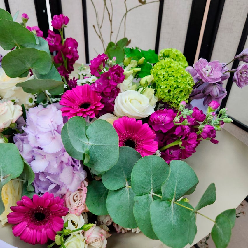 Каждый компонент этой сложной цветочной мозаики несёт свою историю. Гортензии выращивают преимущественно во Франции, Нидерландах, Южной Америке — именно там создаются идеальные условия для полноты цвета и крупности соцветий. Эустома родом из Северной Америки, но сегодня активно культивируется по всему миру за потрясающую живучесть и универсальность. Сантини и маттиолы выращиваются в Европе, чуть меньше — в Азии, где им удаётся достичь идеальных параметров свежести и насыщенности оттенков. Вибурнум, известный в народе как калина, распространён в умеренных широтах Евразии и Северной Америки. Эвкалипт, придающий композиции аромат чистоты, поставляют из Австралии и Средиземноморья.