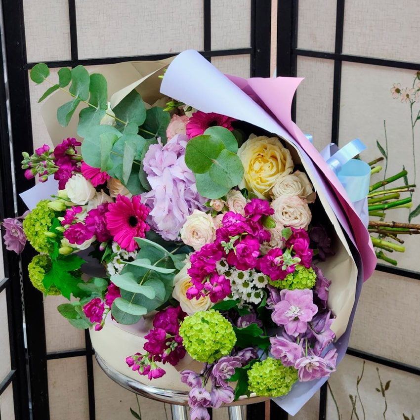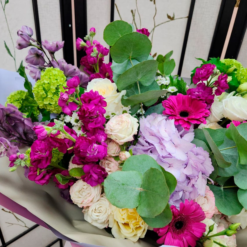 Философия букета строится на гармоничном сочетании сортовых цветов: вдохновляющая эустома, игривая сантини, душистая маттиола, изысканные розы кустовые, округлые вибурнумы и романтичная гортензия. Бархатистая зелень и пряные акценты эвкалипта ненавязчиво подчеркивают цветочную палитру, раскрывая природную красоту каждого стебля. В центре этой симфонии — роскошная гортензия. Её крупные воздушные соцветия переливаются оттенками розового или фиолетового, добавляя композиции глубину и шарм. Эустома, грациозная и благородная, вносит ноты весенней свежести. Эти цветы поражают своей стойкостью и хрупкой красотой одновременно — их бутоны кажутся невесомыми, а прямые стебли говорят об особой аристократичности. Сантини — символ радости, гармонии, солнечного беззаботного настроения. Маленькие хризантемы напоминают ласковые солнечные лучи и мастерски контрастируют с утонченными маттиолами: последние обогащают композицию пряным ароматом и флером старинных садов. Завершают букет миниатюрные кустовые розы — воплощение женственности и романтики, округлый вибурнум, освежающий своей неброской зелёной округлостью, а также натуральные нотки сдержанного эвкалипта и изумрудной зелени.