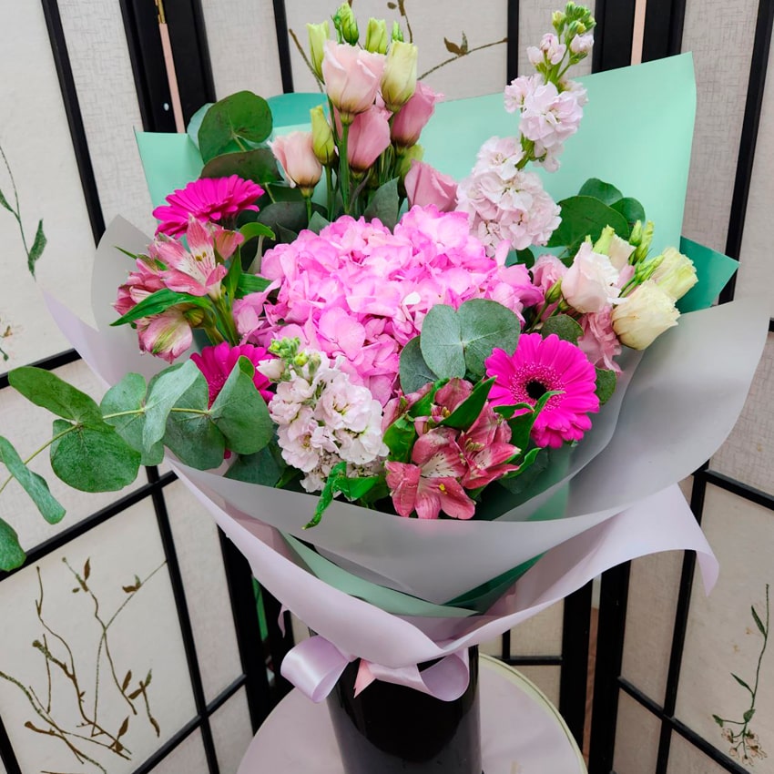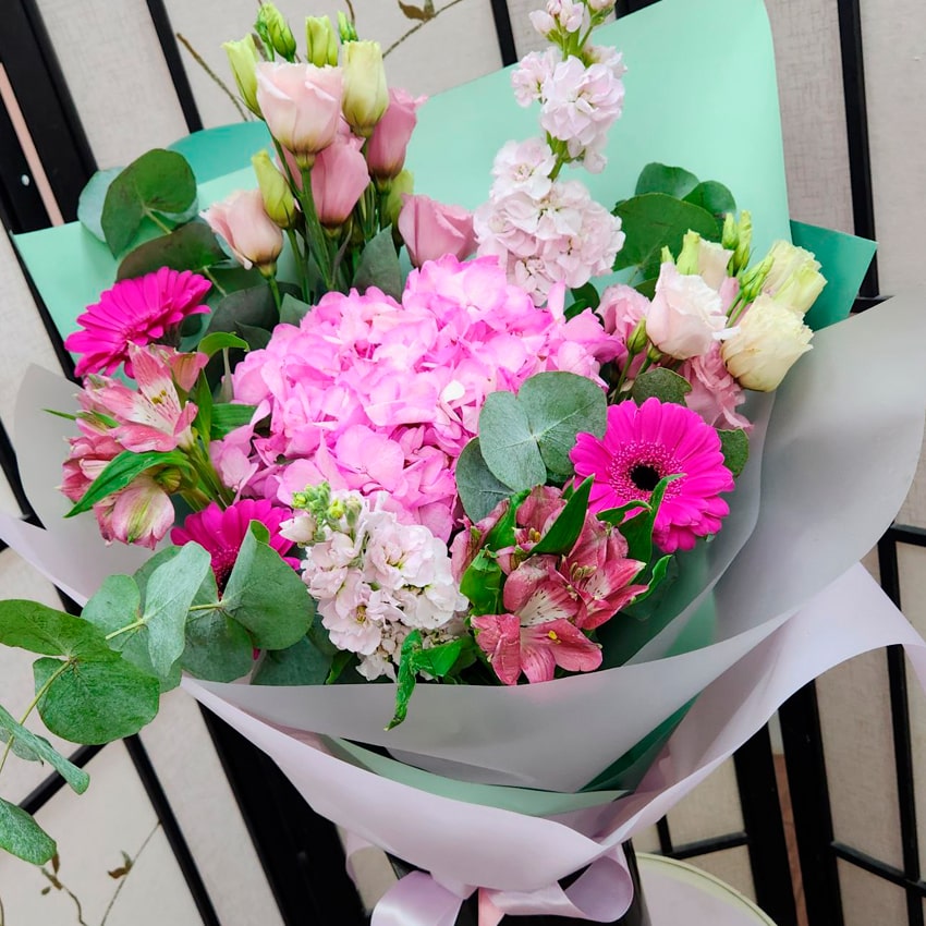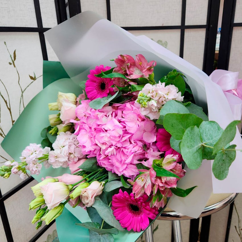 Букет в формате микс всегда остается вне времени и трендов — это выбор для ценителей индивидуальности и натуральной красоты. Мастерски подобранное соотношение крупных и мелких соцветий, значимых акцентов и скромных оттенков позволяет подарить массу эмоций, ведь здесь учтён каждый нюанс. Композиция отличается необыкновенной стойкостью: гортензия, эустома, альстромерия и зеленые побеги долго сохраняют свежесть, радуя владелицу удивительной палитрой чувств и форм. Цветовое сочетание идеально подходит для любого интерьера и повода, а сам букет легко адаптируется как для строгого, так и для романтического образа.