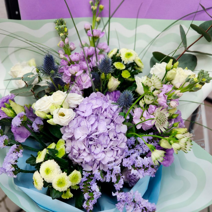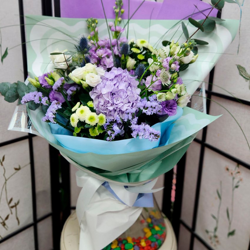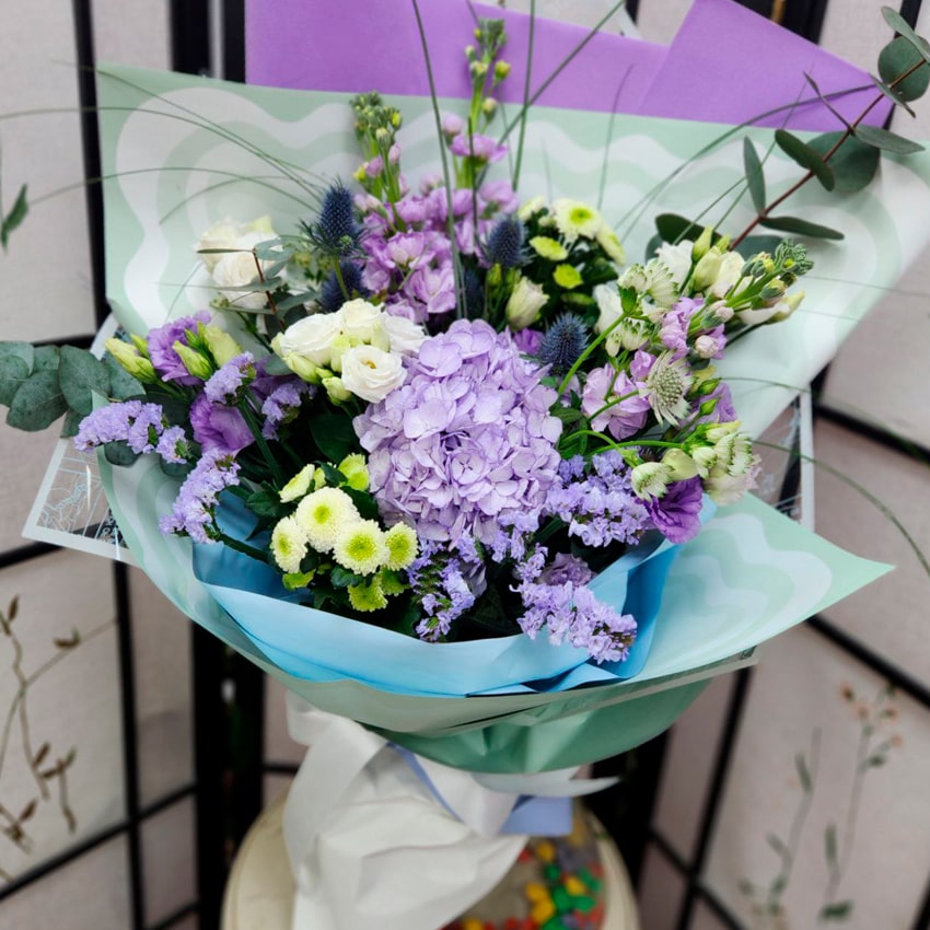 Каждый цветок в букете — путешественник с уникальной историей происхождения. Гортензия процветает в Японии и на просторах Южной Азии, маттиолу выращивают в тёплых регионах Средиземноморья и Европы. Сантини появилась благодаря старания селекционеров из Нидерландов и Японии. Статица с её воздушными соцветиями пришла из побережья Средиземноморья. Эрингиум — уроженец евразийских и европейских степей, вдохновлённый бескрайними просторами. А эвкалипт, родом из Австралии и Тасмании, известен во всём мире своим уникальным ароматом, приносящим свежесть и лёгкость.
