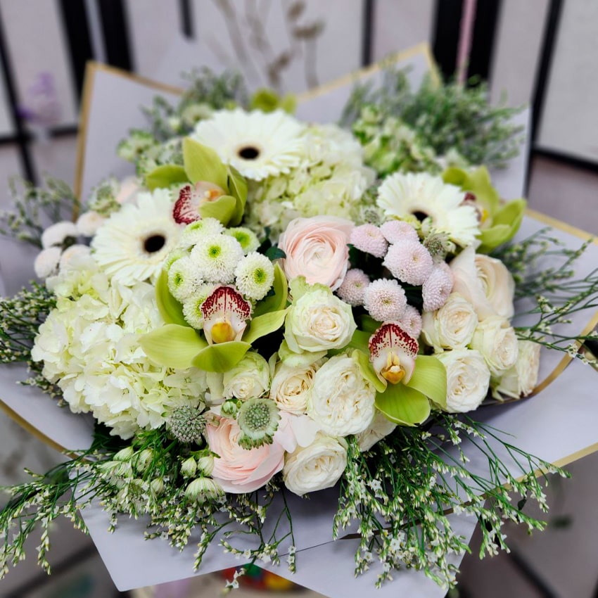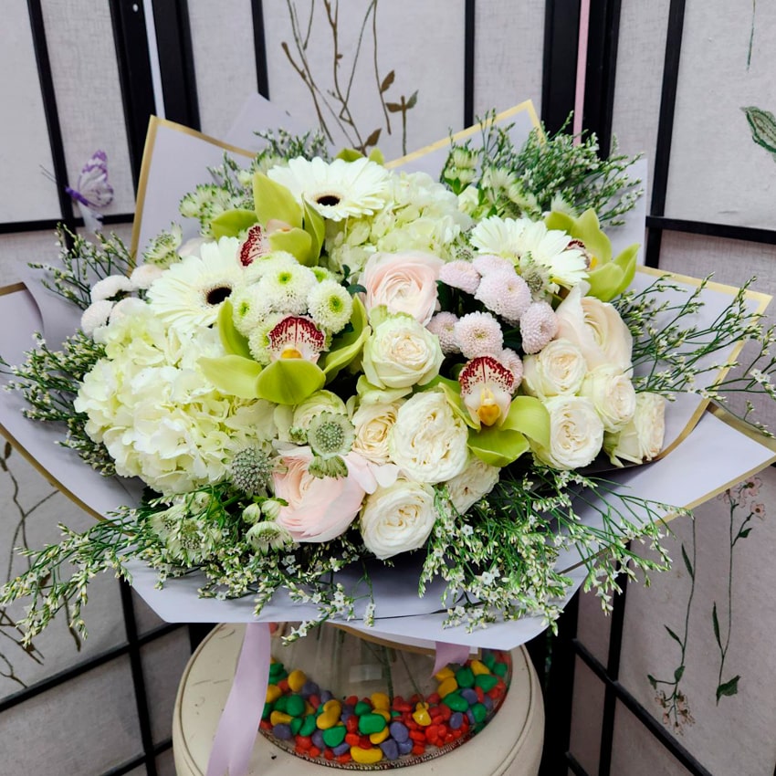 Композиция включает в себя гортензии — 2 шт., сантини — 5 шт., орхидеи — 5 шт., лимониумы — 7 шт., ранункулюсы — 5 шт., герберы — 3 шт., розы кустовые — 5 шт., зелень пучком — 2 шт., эвкалипты — 3 шт. Каждая из культур играет особую роль: гортензия обрамляет и придаёт выразительную мягкость, сантини вносит элемент легкости, орхидея увлекает восточной загадкой, лимониум пленяет ажурной фактурой, а ранункулюсы наполняют букет изысканной нежностью. Герберы добавляют праздничность, розы кустовые — символ искренних чувств, зелень придаёт свежести, а эвкалипт — стойкий аромат и трендовое звучание.