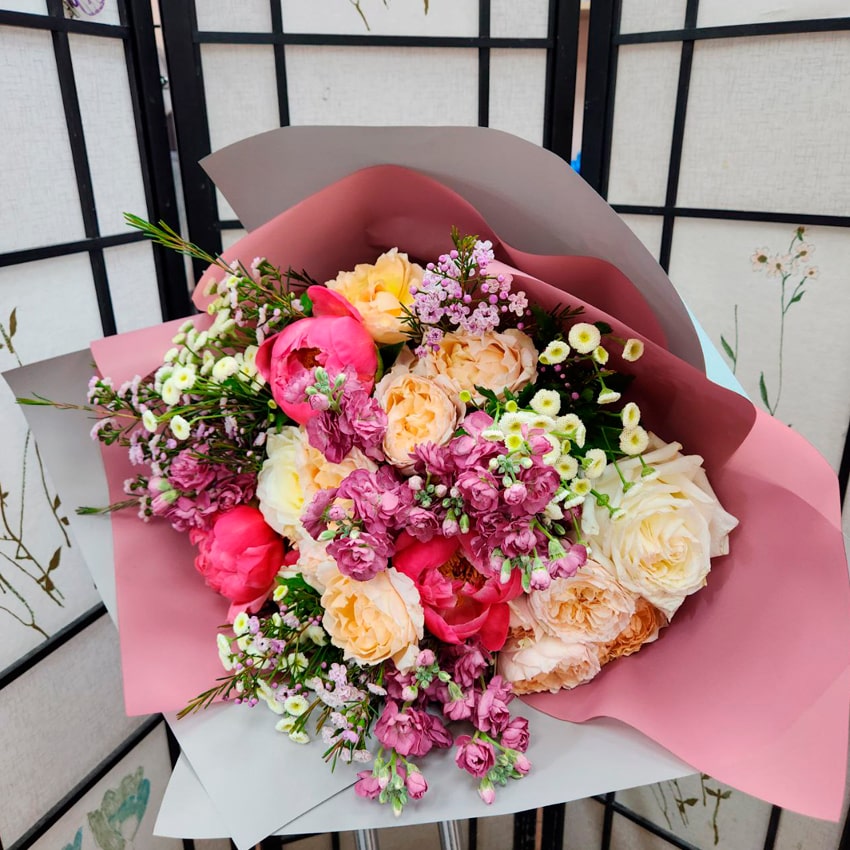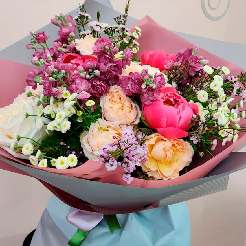 Этот авторский микс собран из цветов с разных уголков мира. Пионы и маттиолы чаще всего вырастают на европейских просторах и частично в Азии — там климат способствует формированию пышных бутонов и насыщенных красок. Розы Джульетта Эквадор выращиваются высоко в горах, где особые погодные условия позволяют добиться исключительной стойкости и глубины оттенков. Ваксфлауэр — уроженец солнечной Австралии, сантини — европейский и азиатский «гость», а зелень попадает в букет с тщательно отобранных южных плантаций.
