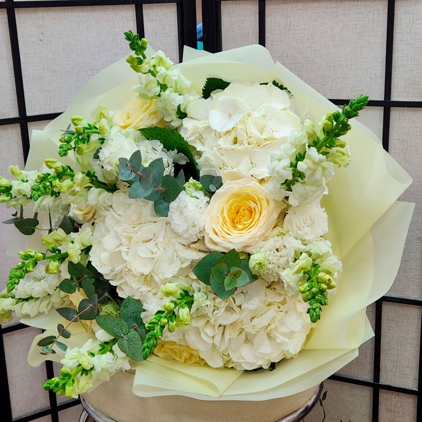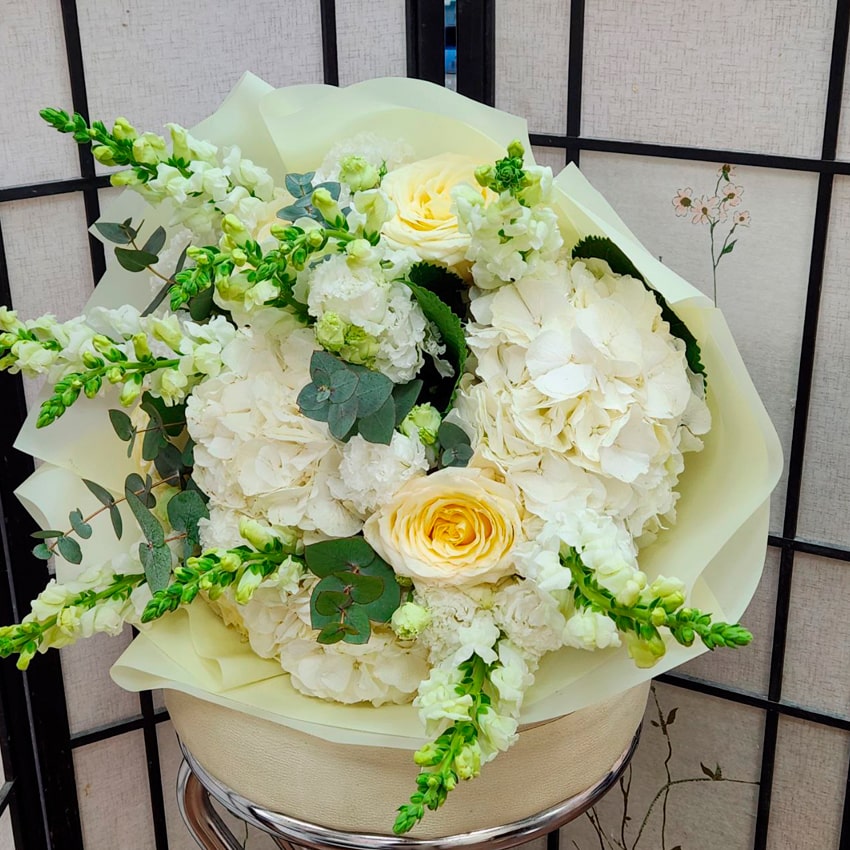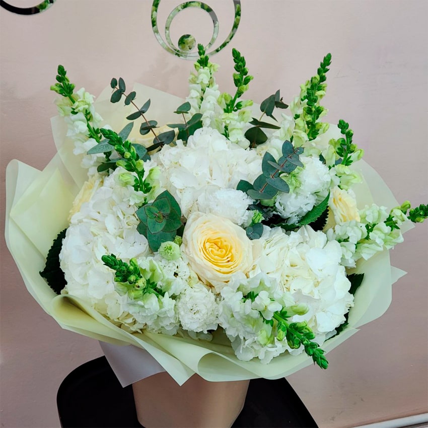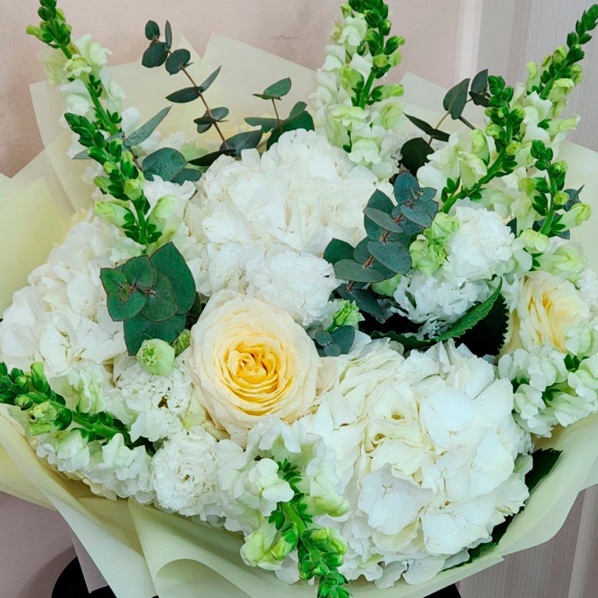 В композиции соединились гортензия, эустома, левкой, розы премиум-класса из Эквадора, а также веточки эвкалипта и нежная срезанная зелень. Каждое растение здесь играет особую роль — создаёт настроение, раскрывает оттенки характера букета и придаёт ему завершённость.