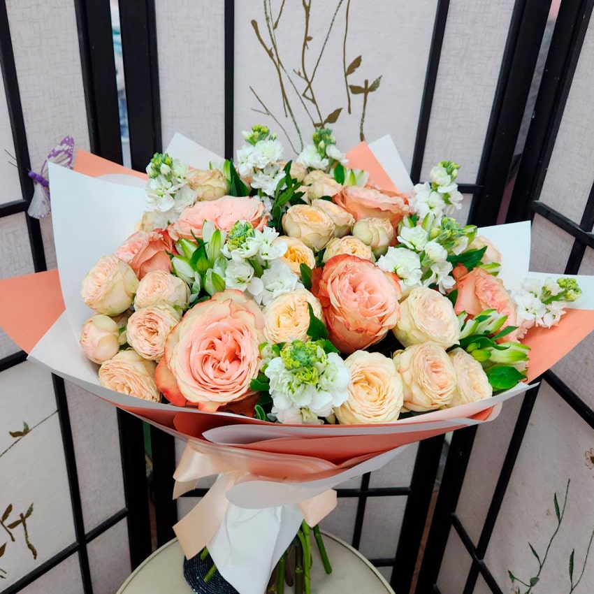Маттиола, известная своим непередаваемым ароматом, великолепно дополняет цветочную композицию. Этот цветок символизирует искренние чувства и верность. Его фиолетовые и кремовые оттенки переплетаются, создавая восхитительный контраст с нежностью розы. Маттиола часто ассоциируется с романтическими вечерами и нежностью, что придает букету особую изысканность и атмосферу уюта.