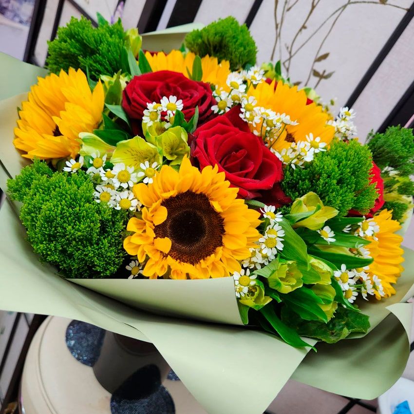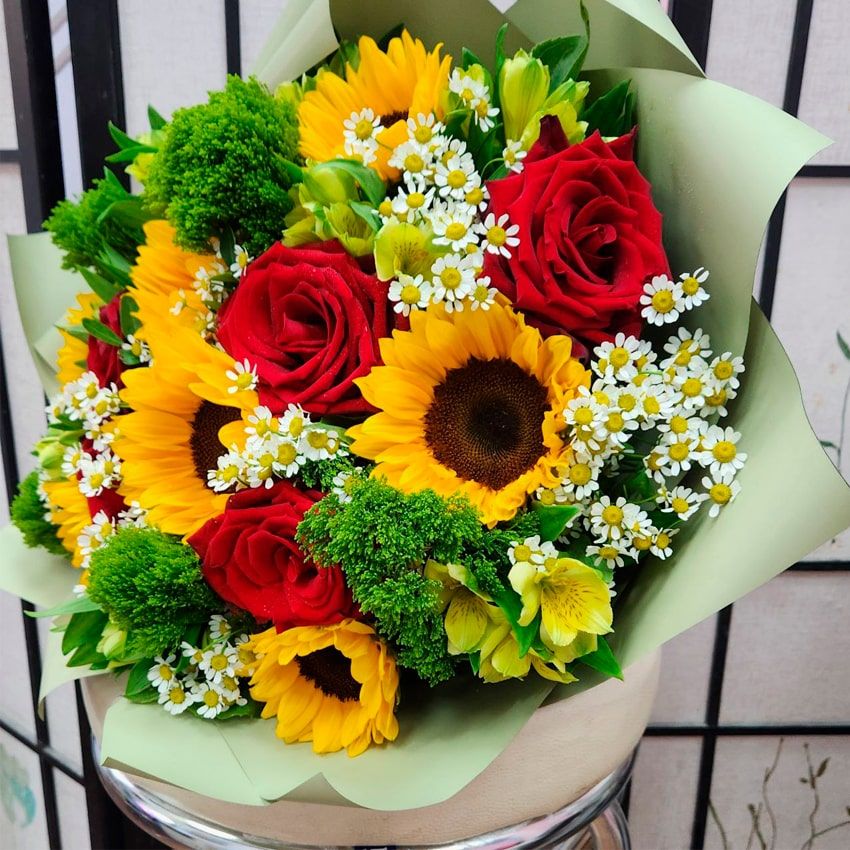 Каждый элемент здесь подобран неслучайно, раскрывая свою индивидуальность и усиливая гармонию впечатлений. Красные розы из Эквадора привносят ноту утончённости и страсти, напоминая о вечных чувствах и благородстве. Жёлтые подсолнухи, словно маленькие солнца, озаряют пространство радостью и дарят тепло. Зелёные акценты добавляют свежести, динамики и природного шика, объединяя композицию воедино и подчеркивая её энергию.