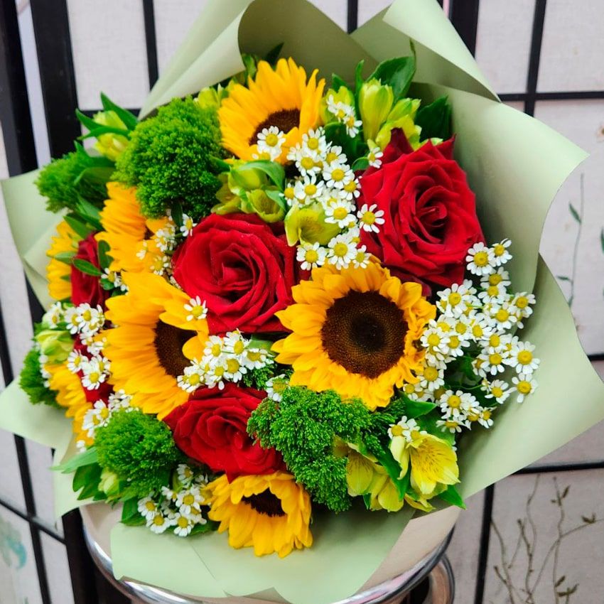 Этот букет воплощает оптимизм, благодарность и радость жизни. Яркие подсолнухи говорят о верности, успехе и уверенности в себе – они наполняют день светом. Розы красного цвета добавляют тепла, признательности и благородства. Альстромерии символизируют дружбу, долгие отношения, поддержку и светлую память. Танацетумы ассоциируются с искренними пожеланиями счастья и тепла. Природная зелень умиротворяет, создаёт ощущение гармонии с окружающим миром.
