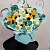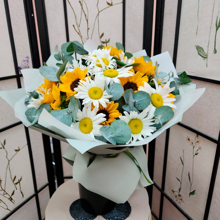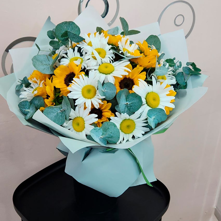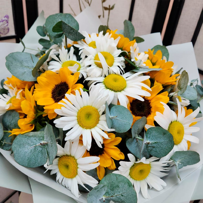 В основе — подсолнухи мини с компактной шапкой семян и упругим стеблем, устойчивые к дороге и перепадам температуры. Ромашки добавляют воздушный ритм и полевую искренность, их лепестки снежно-белые, центр мягко-золотистый. Эвкалипт привносит аромат прохлады и графичную линию, стабилизируя объём за счёт пружинистых ветвей. Зелень пучок собирает фактуры, подчёркивая объём и естественный силуэт.