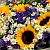 Жёлтые солнечные цветы символизируют жизнелюбие и силу. Их крупные лепестки словно собраны из солнечных искр, они визуально наполняют пространство теплом, заряжают позитивом. Белые танацетумы добавляют мягкости и лёгкости, создают эмоциональный баланс. Фиолетовые статицы служат изысканным контрастом — цветом мудрости, мечтательности и глубины. А зелень завершает композицию, придавая ей свежесть и структуру.