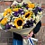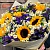 По своему составу эта композиция отличается богатством текстур. Пушистые соцветия танацетума дают невесомость, плотные лепестки солнечных цветов — объём и насыщенность, а статица добавляет структурную точность. Зелёный пучок символизирует природную силу и здоровье, визуально связывает все цвета в одно целое.