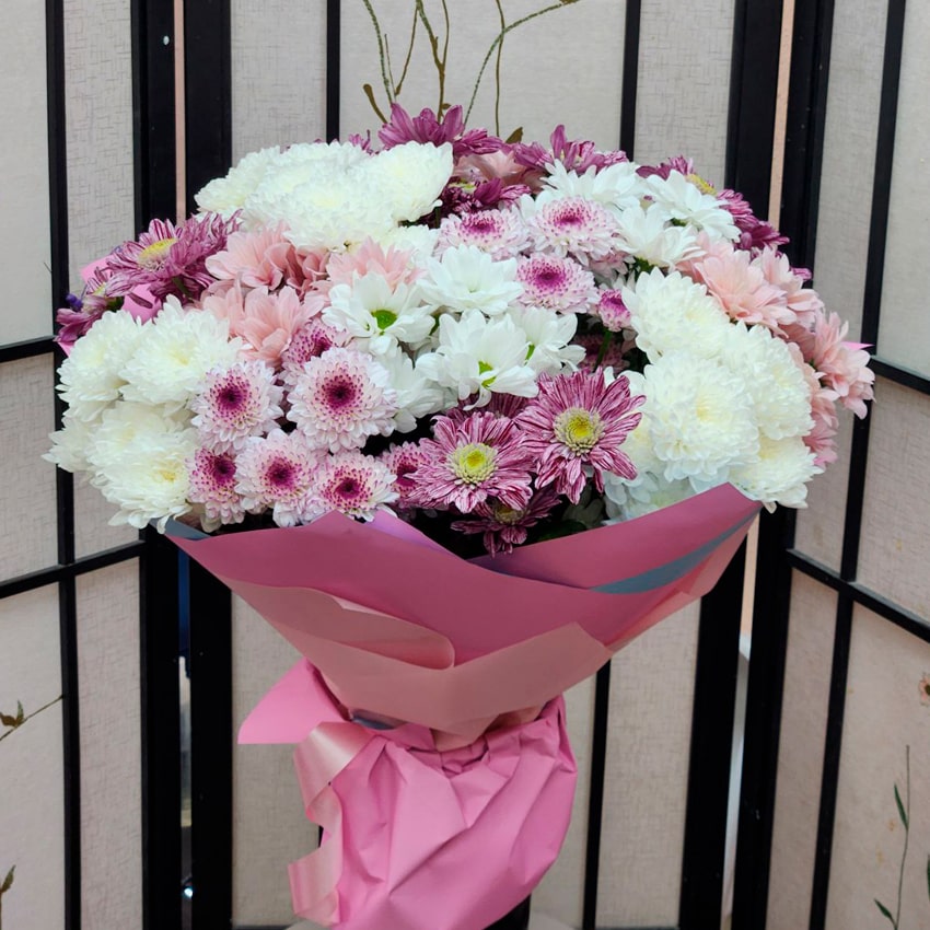 Кустовые хризантемы микс олицетворяют собой богатство цветовой гаммы: чистый белый, яркий желтый, насыщенный малиновый и глубокий фиолетовый. Этот калейдоскоп оттенков не только радует глаз, но и создает настроение. Белые хризантемы символизируют чистоту и невинность, желтые – радость и дружбу, малиновые – страсть и энергию, а фиолетовые – мудрость и восхищение. Каждое сочетание добавляет особую ноту в готовую композицию, благодаря чему монобукеты из хризантем становятся универсальным подарком на любой случай.