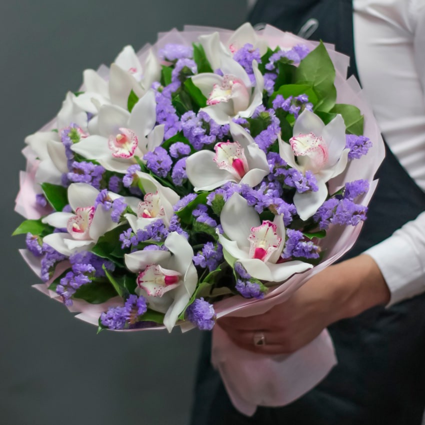 Статица, известная как “цветок-сухоцвет”, родом из Средиземноморья и Центральной Азии, ценится флористами за стойкость и декоративность. Её маленькие, но яркие соцветия прекрасно структурируют букет, придавая ему воздушность и объём. В белом варианте статица подчёркивает утончённость орхидеи, а в фиолетовом — усиливает насыщенность и впечатление контраста, создавая эмоциональную насыщенность гармоничного образа.