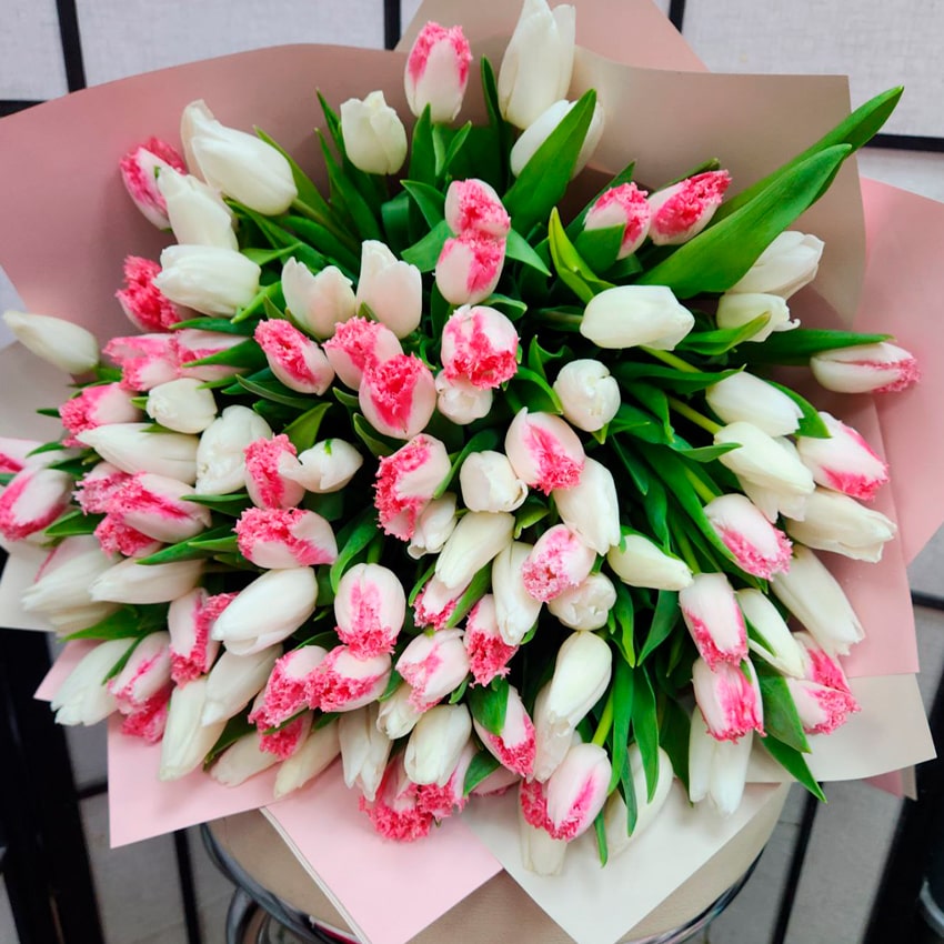 Бело-розовая гамма — воплощение трепета, искренности, нежности, обновления. Белый оттенок ассоциируется с чистотой, гармонией, новыми возможностями, а розовый — с теплом сердечных чувств, романтикой, благодарностью. Такой букет будет органичен на свадьбах, утренниках, при поздравлении с рождением ребёнка, юбилеях или признаниях в любви и заботе. Важно, что бело-розовые пионовидные тюльпаны не только подчёркивают глубину эмоций, но и сохраняют уместность в официальной обстановке, создавая ауру элегантности и доверия.