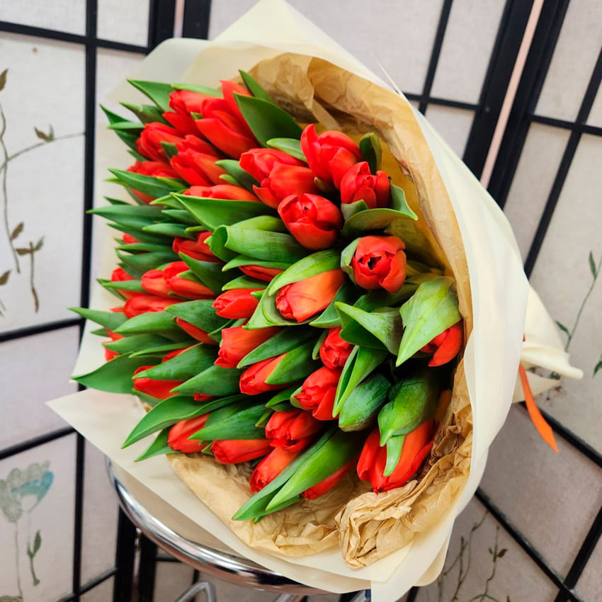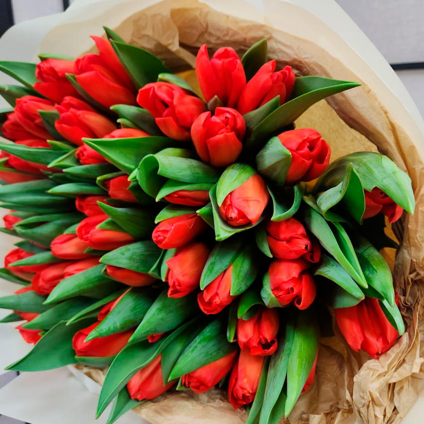 Красные тюльпаны известны своей удивительной стойкостью. Их плотные лепестки лучше других сохраняют форму, а упругие стебли долго держат свежесть даже в условиях переменной температуры. В букете из 55 штук эта устойчивость становится особенно ощутимой, ведь композиция сохраняет выразительность не один день. Аромат у тюльпанов лёгкий, едва уловимый, что делает их универсальным подарком для дома или офиса.