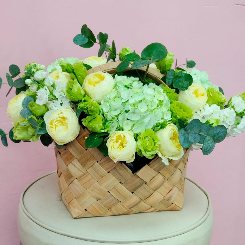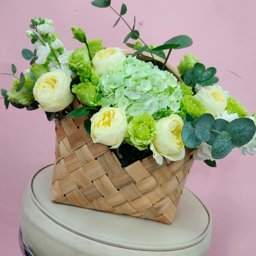 Гортензия, добавленная в эту уникальную корзину, становится настоящим завершающим штрихом. Ее округлые соцветия, насыщенные зелёные и нежно-голубые оттенки, несут ощущение свежести и естественности. Гортензия символизирует изобилие и благодарность, и она идеально подходит как для выражения признательности, так и для создания уютной атмосферы в доме или офисе.