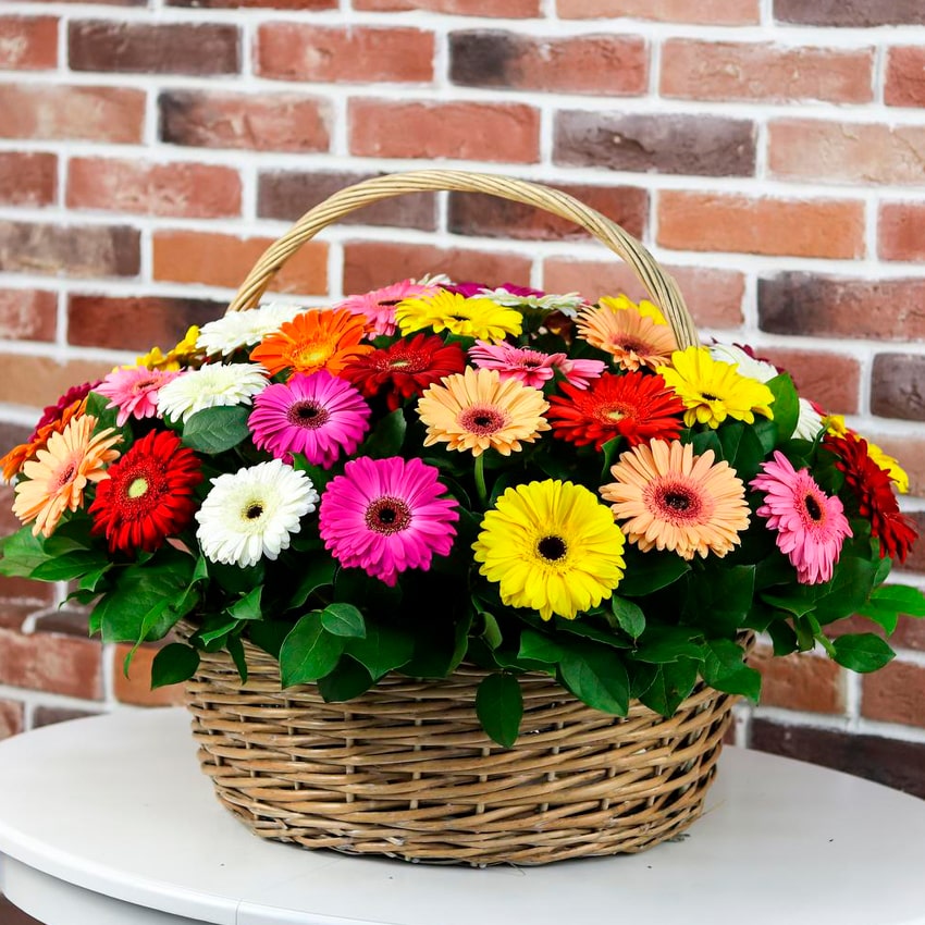 Каждая корзина содержит 7–15 крупных головок гербер в гармоничной палитре: белые дают ощущение чистоты и утончённости, жёлтые — солнечную энергию и радость, зелёные — свежесть и современность, розовые — мягкость и романтику, фиолетовые — глубину и благородство. Дополняет композицию пучок зелени: фисташка, эвкалипт, аспидистра или салал. Основа — аккуратная корзина из натуральных материалов или стильный короб, декоративная подложка и флористическая пена для долголетия.