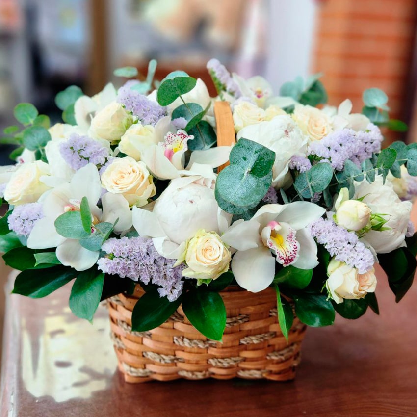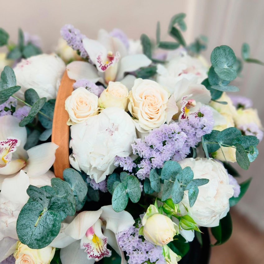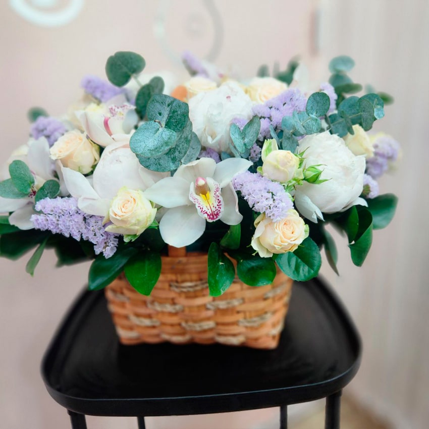 В основе — пышные пионы, известные своей насыщенной чашей лепестков и мягким ароматом; кустовые розы Эквадор отличаются удлинённым бутоном, стойкостью и насыщенной гаммой розовых и кремовых тонов. Орхидеи вносят тонкую графику лепестка и долголетие окутывающего взгляда, статица закрепляет цветовой акцент благодаря плотным сухим соцветиям в лилово-фиолетовой гамме. Эвкалипт добавляет смолянистый, свежий аромат и структурные силуэты, зелень пучок обеспечивает фон и объём, поддерживая форму корзины и продлевая срок жизни букета.