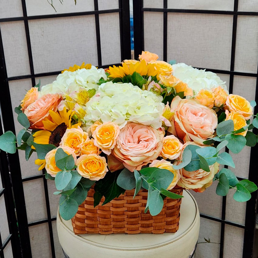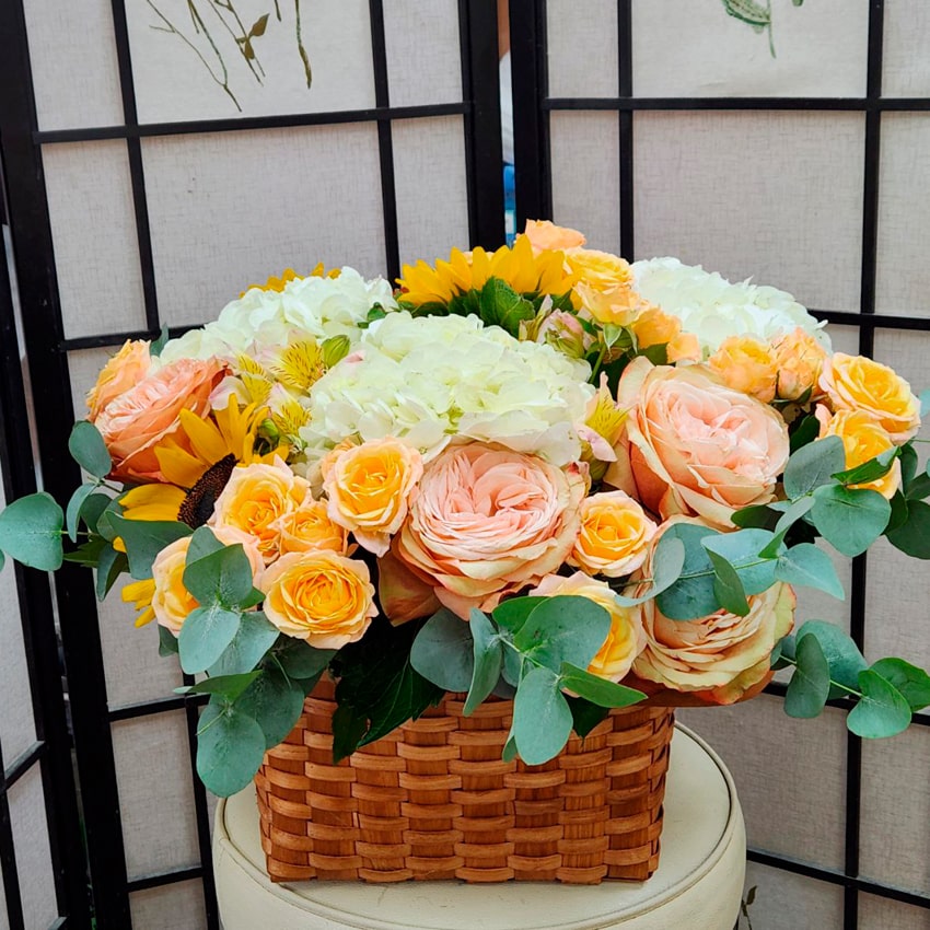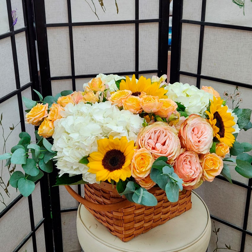 Состав корзины — тщательно продуманный ансамбль: ароматные розы, нежные хризантемы, воздушные альстромерии, эустомы, иногда дополненные зеленью эвкалипта или аспидистры. Такое соединение формирует структурный контраст — мягкие изгибы лепестков соседствуют с плотной фактурой листвы, создавая визуальную динамику. Композиция выглядит живой и насыщенной, словно дыхание природы в её лучшем проявлении.