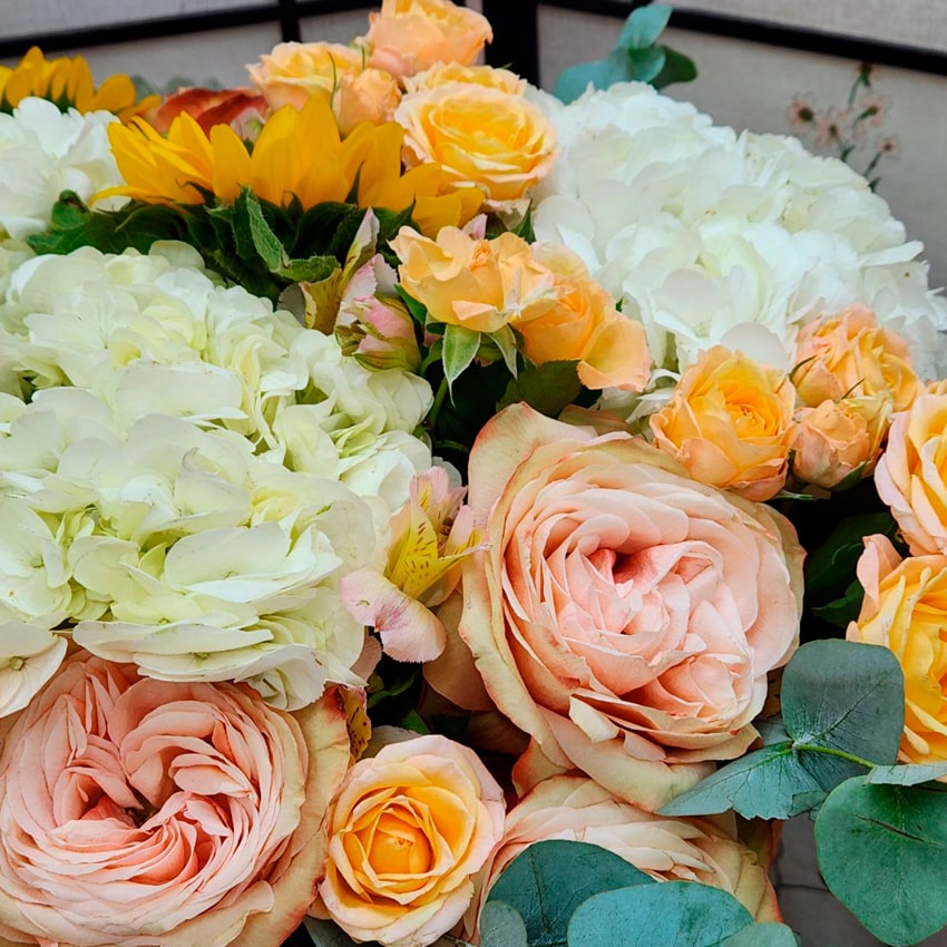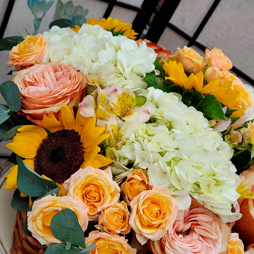 Розовые бутоны добавляют лёгкости и романтики, их мягкий тон вызывает чувство нежности и радости. Белые цветы воплощают чистоту и свет — идеальное решение для случаев, где важно подчеркнуть искренность и гармонию. Чайные и жёлтые оттенки наполняют композицию солнечным настроением, создают положительную энергетику, символизируют благодарность, успех и дружелюбие. Такое сочетание превращает корзину в источник эмоций и вдохновения.