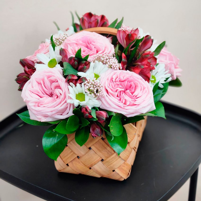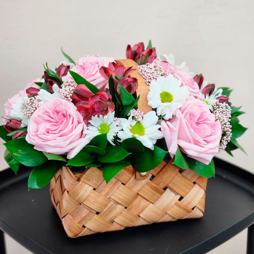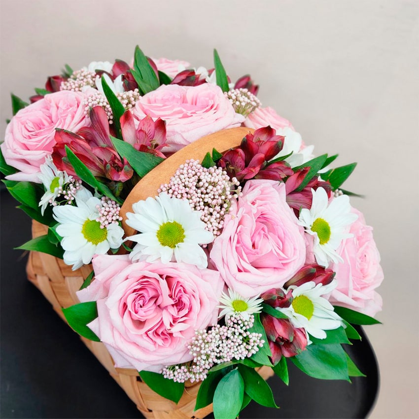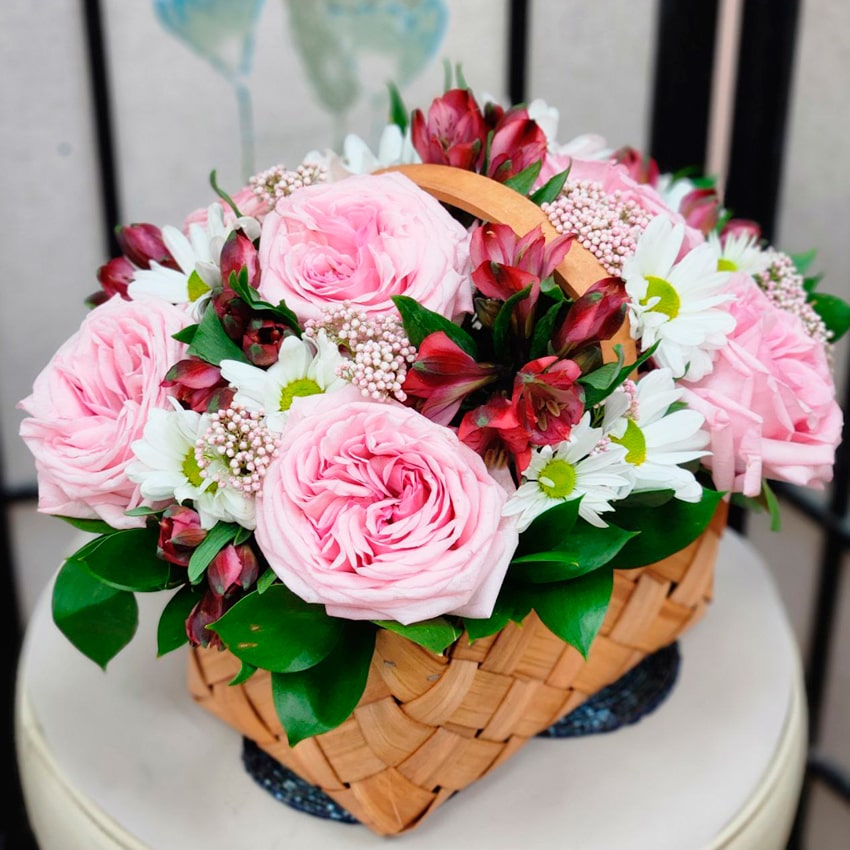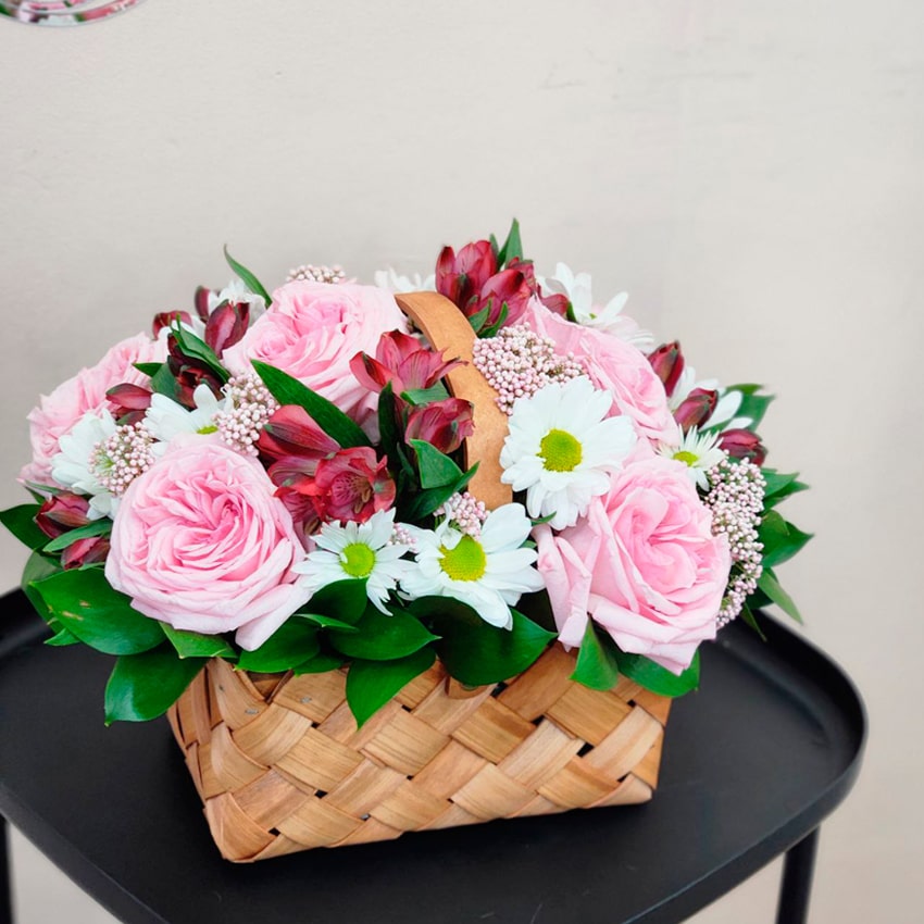 Кустовые хризантемы дают объём и мелкую фактуру, они плотные, стойкие и долго сохраняют свежесть. Альстромерии добавляют графичности и лёгкости, их соцветия работают как связующая нота между крупными розами и мелкой хризантемой. Розы Пинк Охара — премиальная позиция: крупные бутоны, элегантный изгиб стебля и насыщенный розовый цвет придают композиции статус и романтическую глубину. Озотамнус выступает структурной зеленью с тонким ароматом, а пучок зелени формирует фон и поддерживает форму корзины.