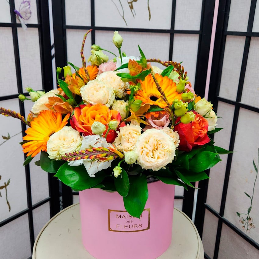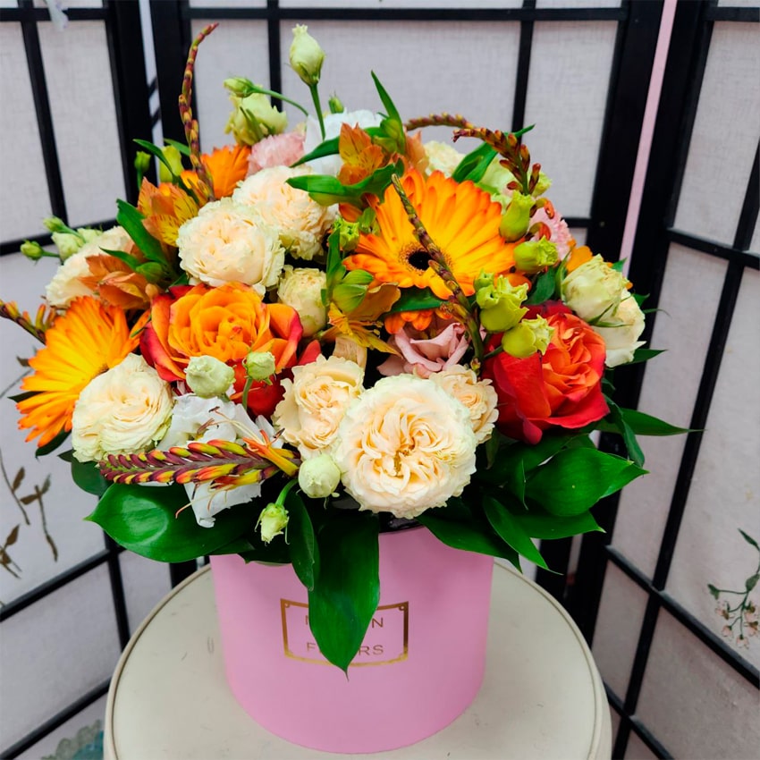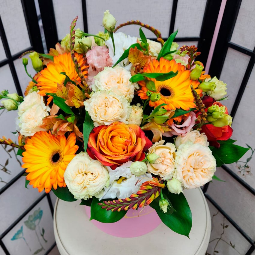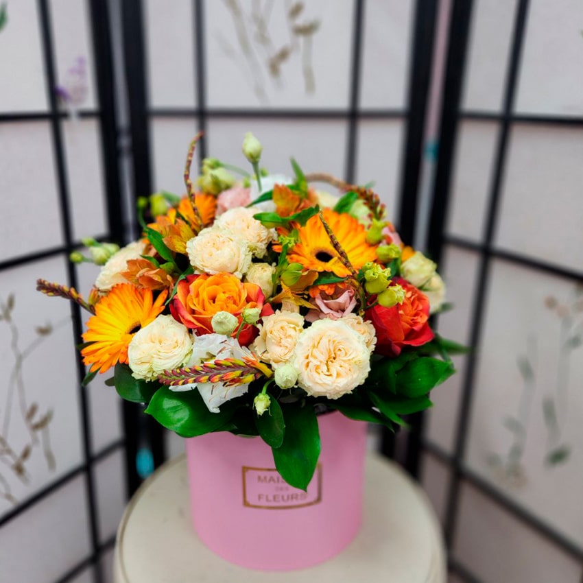 Главная сила этой коробочной композиции — в идеальном балансе форм, красок и запахов. Компактная шляпная коробка не только удобна в транспортировке, но и сохраняет свежесть цветов надолго. Не требуется вазы: достаточно подливать немного воды или лишь слегка опрыскивать зелень — и ваш подарок будет радовать получателя не один день. Практичность, эстетичность и современность — три кита этого формата.