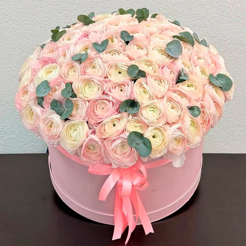 Композиция в шляпной коробке с пропиткой Оазис, собранная из 59 ранункулюсов и пучка эвкалипта, выглядит как живая миниатюра весеннего сада. Нежные бутоны розовых и фиолетовых оттенков создают глубокую палитру, где мягкость соединяется с выразительностью, а густые лепестки формируют воздушный объем и впечатление непрерывного цветочного облака. Такая композиция не просто украшение, а эмоциональный акцент, который наполнен символами и природной энергетикой.