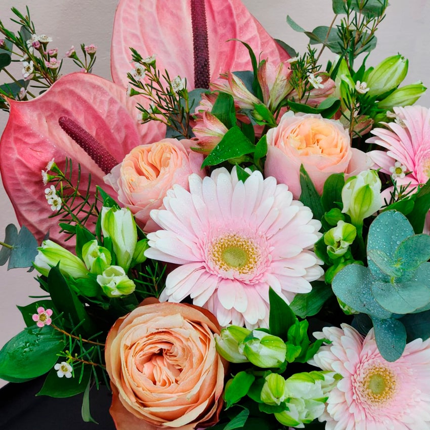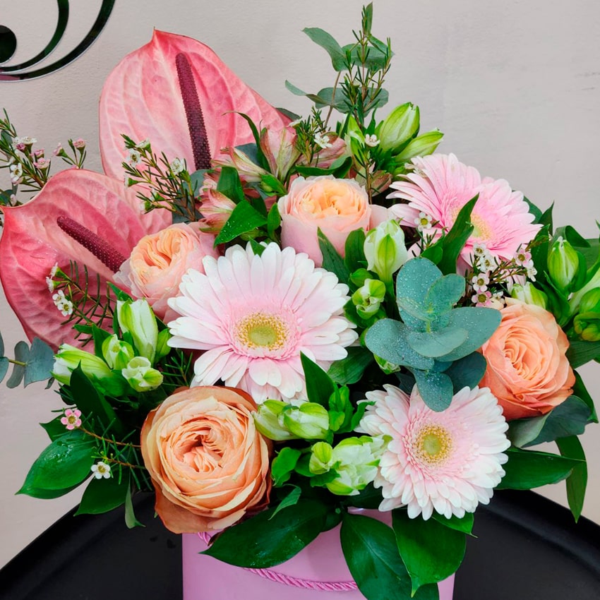 В состав данной композиции входят изысканные антуриумы, благородные розы Эквадор Кахала, утончённые ваксфлауэры, нежные альстромерии, очаровательные герберы и свежая зелень. Каждый цветок выбран не случайно. Антуриум, известный своей необыкновенной формой и густым, насыщенным цветом, символизирует искренность, страсть и внимание. Розы Кахала из Эквадора, славящиеся сочной палитрой и стойкостью, олицетворяют восхищение и уважение – эти цветы не вянут долгое время, оставаясь такими же красивыми, как в момент вручения. Ваксфлауэр придаёт композиции нежность и лёгкость, символизирует надежду и обновление. Альстромерия, благодаря своим разноцветным лепесткам, ассоциируется с дружбой, поддержкой и гармонией. Гербера, как символ радости и открытости, наполняет композицию беззаботностью и свежестью. Дополняет эту цветочную симфонию зелень – она создаёт объём, подчеркивая каждую деталь и усиливая общую выразительность букета.