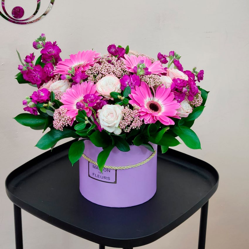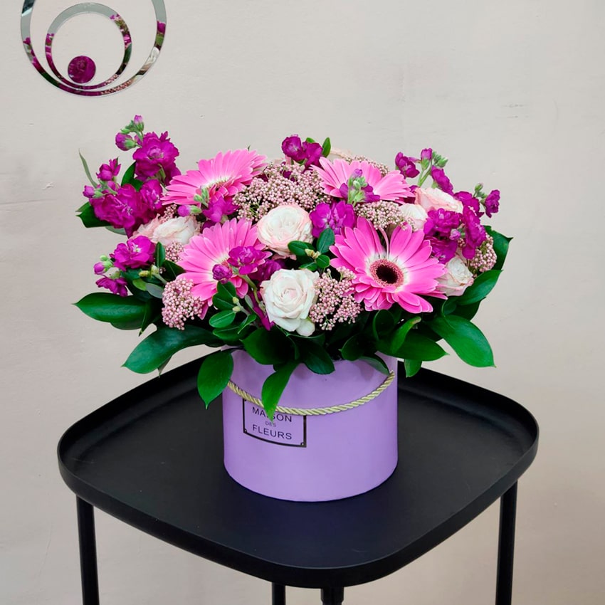 В таинственной шляпной коробке собрались лучшие представители флористики: озотамнусы, кустовые розы из Эквадора, воздушные маттиолы, грациозные альстромерии, выразительные герберы и ароматная зелень. Каждый из этих цветов – отдельный мир, дарящий настроение и новые эмоции. Озотамнус удивляет россыпью миниатюрных соцветий, его текстурные веточки добавляют объемность и лёгкий загадочный аромат. Родом озотамнус из Австралии, где его по достоинству ценят за изысканную стойкость и декоративность. Кустовые розы Эквадор – это символ изысканности, их цветки отличаются бархатистостью, пышностью и неповторимой глубиной оттенка. Эквадорские розы славятся насыщенной палитрой и невероятной стойкостью благодаря благоприятному высокогорному климату Анд. Маттиолы, или душистые ночные фиалки, поражают не только фиолетовой палитрой, но и своим чарующим ароматом, который раскрывается особенно ярко к вечеру. Они родом из Средиземноморья и Южной Европы, олицетворяют верность и чистоту чувств. Альстромерии, трогательные и изящные, символизируют дружбу, доверие и поддержку. Их малиновые, розовые или сиреневые лепестки особенно хорошо смотрятся в воздушных композициях, подчеркивая сложность сборки и оригинальность идеи. Герберы – это зажигательные солнечные цветы, заряжающие позитивной энергией и радостью жизни, прекрасно вписываются практически в любой интерьер и всегда остаются в центре внимания. Завершает ансамбль свежая зелень, добавляющая природное дыхание и деликатно обрамляющая цветочную коллекцию. Зелень формирует контраст, раскрывает оттенки цветов и делает композицию еще более живой и объемной.