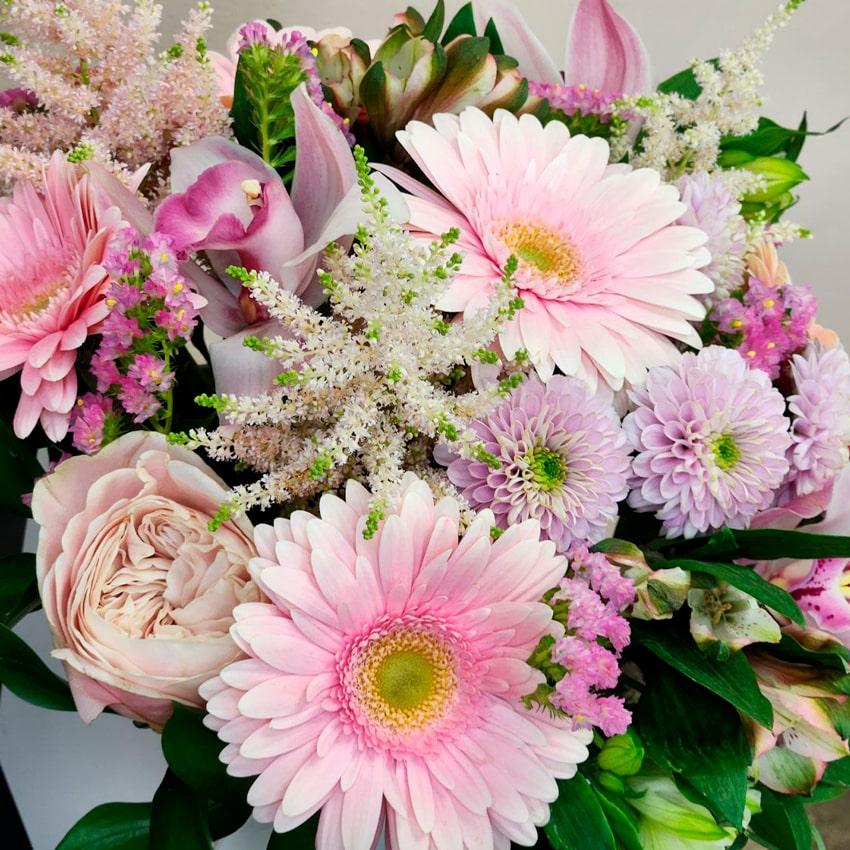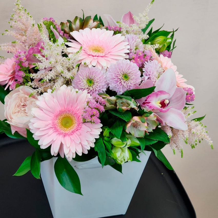 Орхидеи — воплощение утонченности и безусловной красоты. Их лепестки завораживают структурой, необыкновенным блеском и шелковистостью. Символизируя роскошь и аристократичность, орхидеи идеально подходят для особых случаев. В природе их можно встретить в тропических лесах Азии и Южной Америки, где влажный климат создаёт удивительные условия для цветения. Розы Эквадор Кахала — изюминка коллекции. Этот сорт получил мировое признание за необычные оттенки нежного розового и персикового, а также за поразительную стойкость. Выращенные на высокогорных эквадорских плантациях, эти розы вобрали в себя энергию солнца и чистоту морского ветра, что придаёт им особую силу и очарование. Хризантемы, пришедшие к нам из Восточной Азии, несут в себе магию осени и философию долголетия, мудрости, гармонии. Эти цветы ассоциируются с теплом, уютом и верностью, а благодаря пышным соцветиям композиция становится ещё более объёмной и живой. Альстромерии, также известные как «лилии инков», добавляют композиции легкость и свежесть. Их родина — Анды Южной Америки, и именно оттуда альстромерии унаследовали способность долго сохранять красоту среза и дарить радость своим великолепием. Герберы — искренние символы радости и яркости жизни. Их насыщенные розовые и фиолетовые оттенки мгновенно поднимают настроение. Герберы выращивают преимущественно в теплых странах Африки и Южной Америки. Статица — цветок-путешественник, родом из Средиземноморья. Его фиолетовые соцветия ассоциируются с вечностью и неизменностью чувств, а стойкость позволяет сохранять роскошный вид даже спустя недели. Астильба добавляет в ансамбль воздушность, нежность, делает общий рисунок мягким и романтичным. Её родина — тенистые леса Восточной Азии, где цветок получил известность как символ женственности и утончённости.