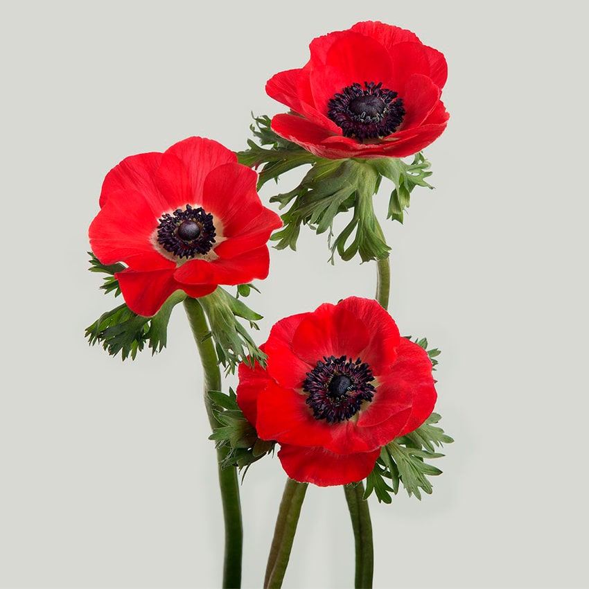 Красная анемона символизирует любовь, отвагу и стремление к жизни. В разных культурах её сравнивают с дыханием весны и с кровью сердца, что делает её особенно выразительной. В букетах эти яркие цветы привносят драматизм и элегантность, они идеально сочетаются с белыми и розовыми оттенками, помогая создать композиции, от которых невозможно отвести взгляд.