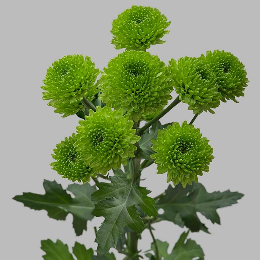 Хризантема Сантини отличается миниатюрными соцветиями, собранными в пышные ветки, каждая из которых будто соткана из нежных изумрудных шариков. Компактная форма, плотная структура лепестков и устойчивость к внешним воздействиям делают этот сорт находкой для флористов. Цветы великолепно держат форму, не осыпаются, долго сохраняют свежесть и насыщенность тона — именно поэтому их так часто используют в создании букетов и интерьерных композиций.