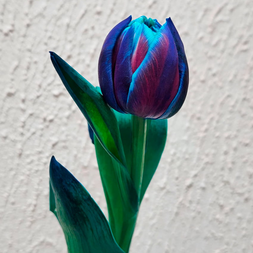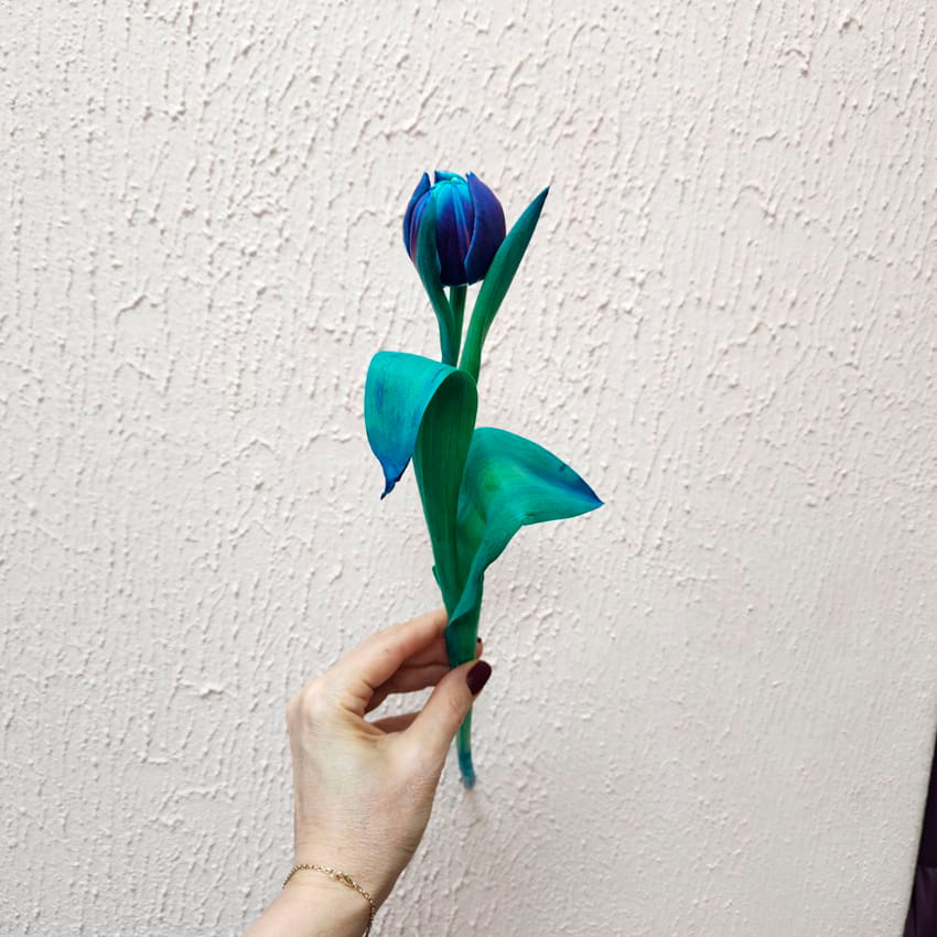 Синий оттенок традиционно связан с мудростью, спокойствием, уверенностью и внутренней гармонией. Такой тюльпан выбирают, чтобы подчеркнуть серьёзность намерений, передать уважение или создать атмосферу загадочности. Он хорошо подходит для особых случаев, когда требуется подчеркнуть индивидуальность подарка.
